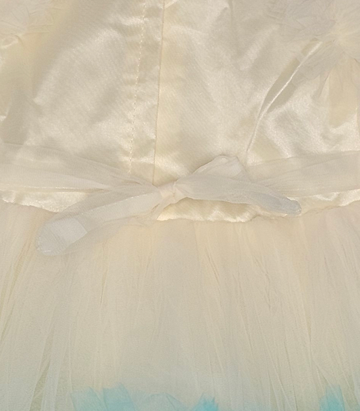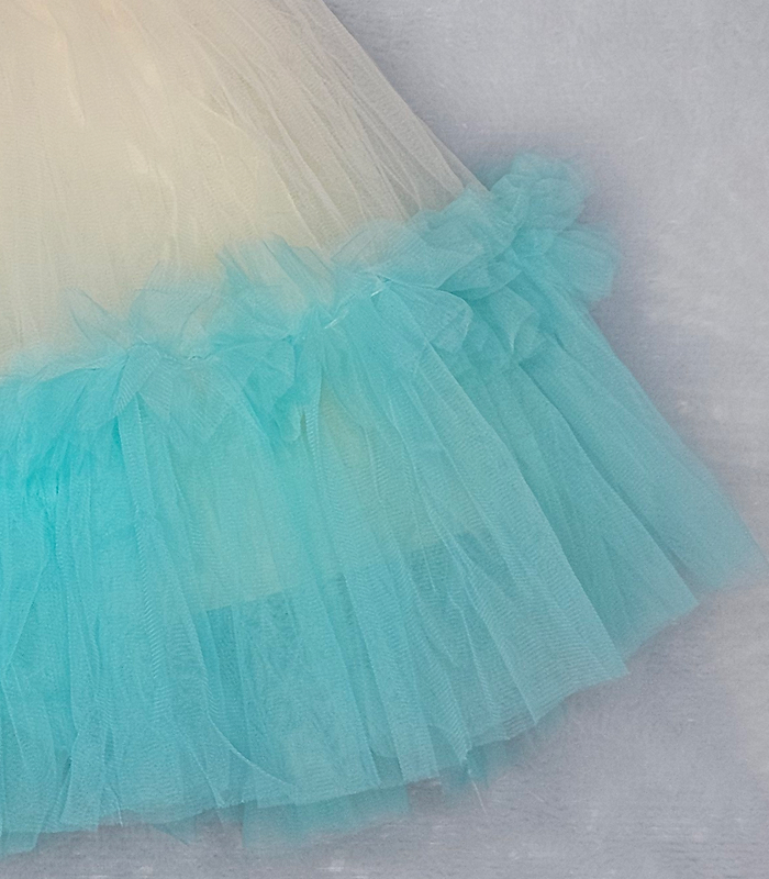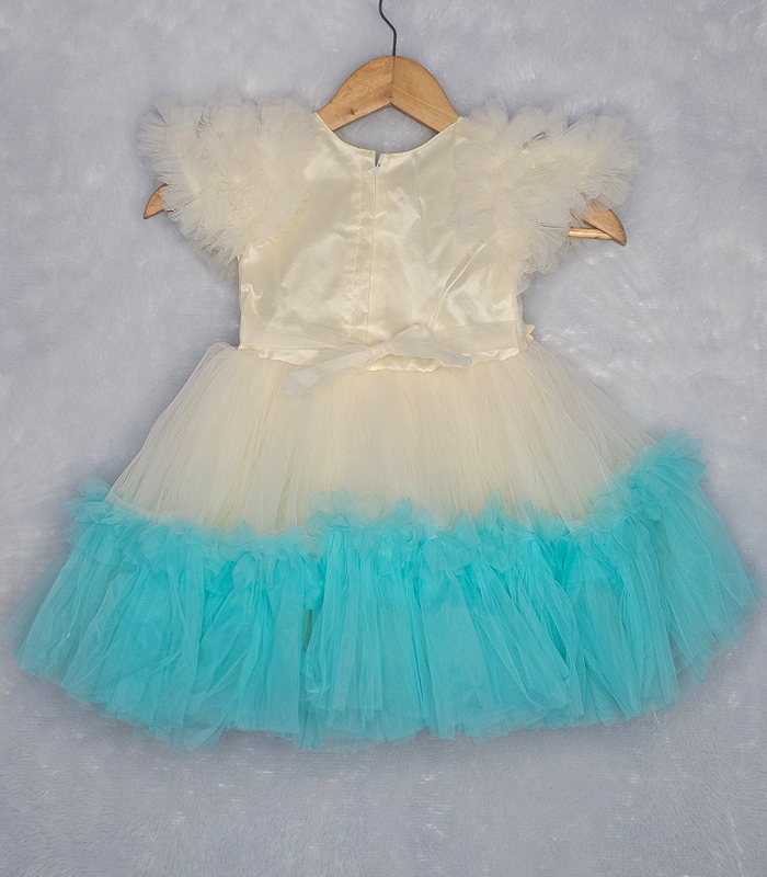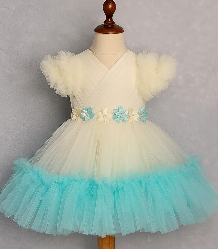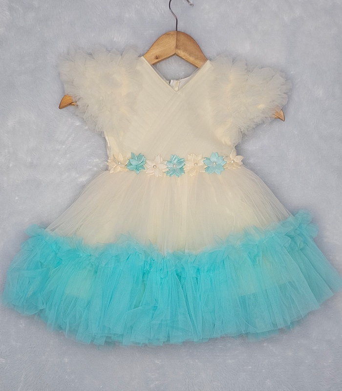 Add a touch of magic to your little one’s wardrobe with this cream and aqua blue net frock, designed for baby girls aged 1 to 4 years. Made with soft tulle and delicate floral accents at the waist, this frock is perfect for birthdays, weddings, or festive occasions. The fluffy ruffle sleeves and layered net hemline make it both elegant and playful, while the breathable fabric ensures all-day comfort.