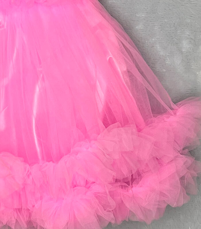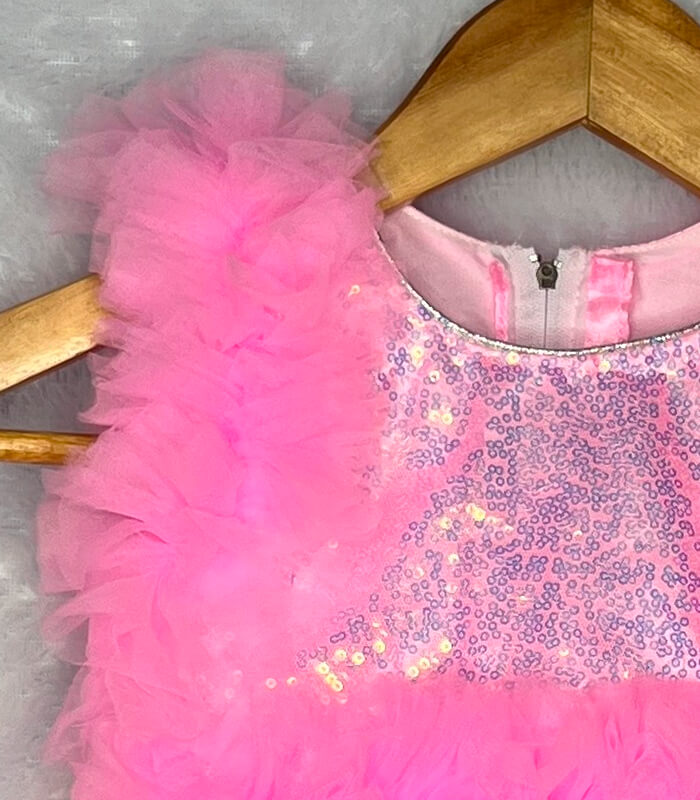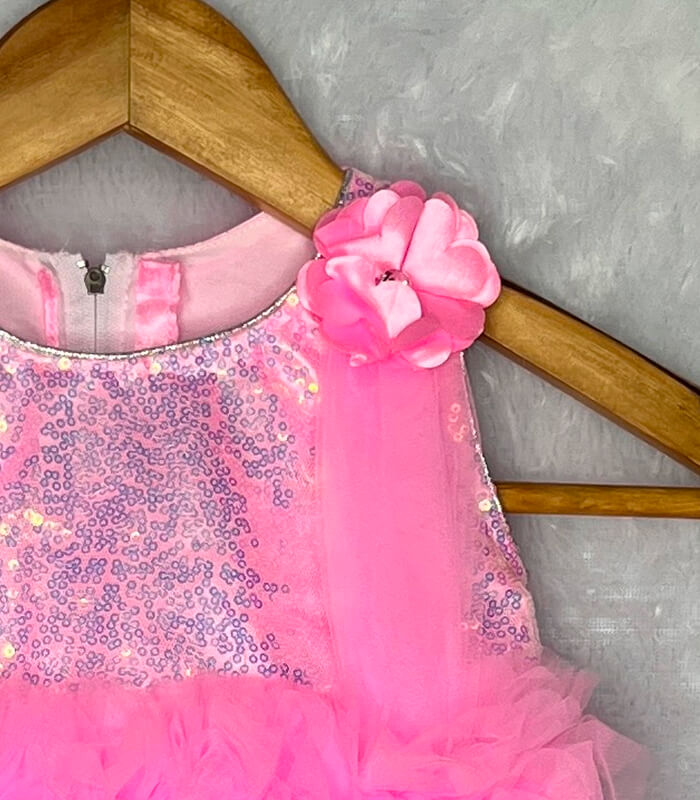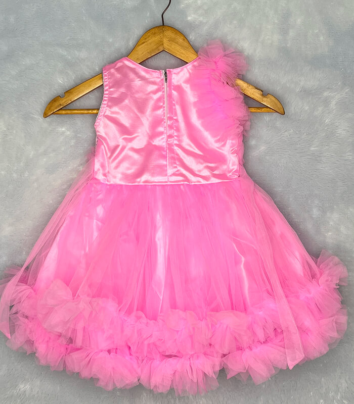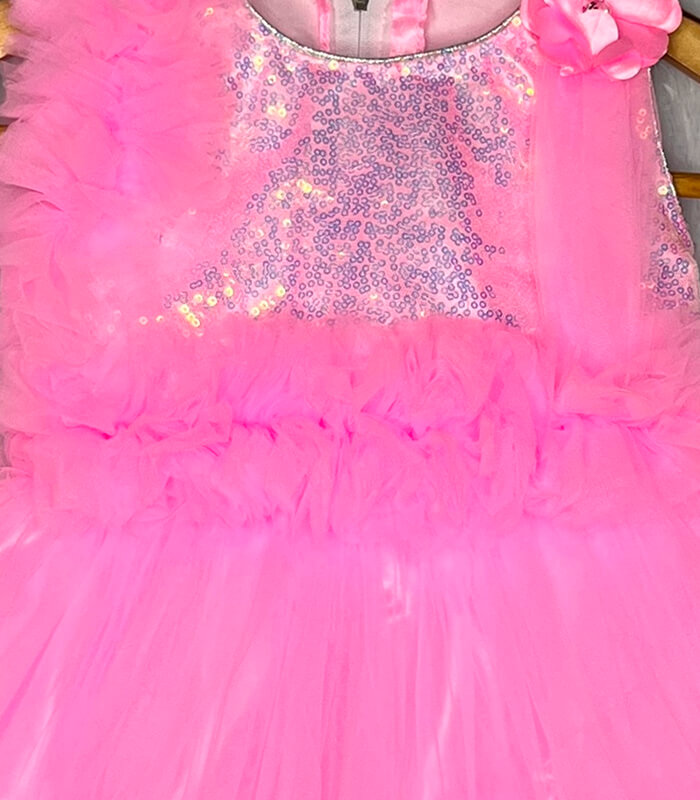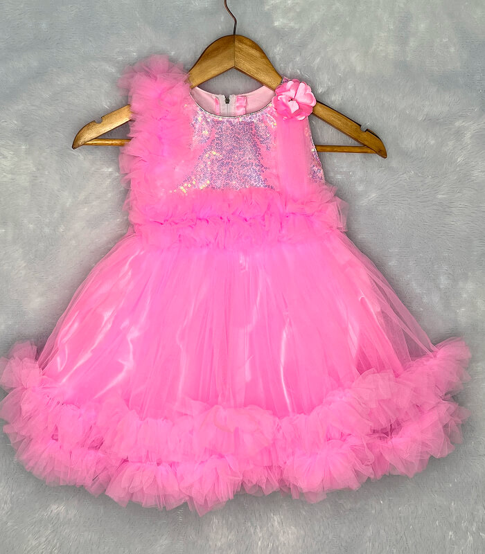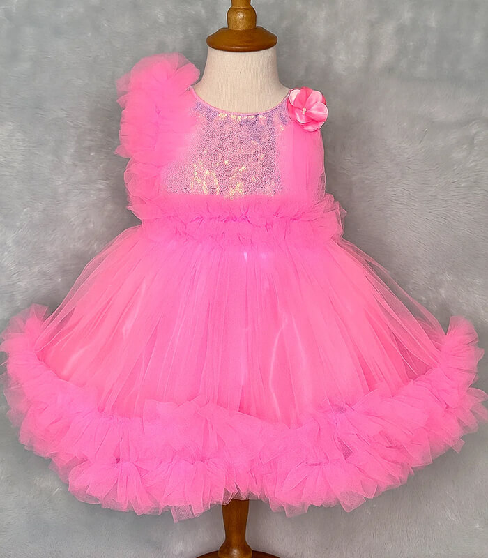 Bright, bold, and beautiful – this Baby pink net frock is the perfect party dress for baby girls aged 1 to 4 years. The shimmering sequin bodice paired with soft, fluffy net layers gives it a dreamy and stylish look. Designed with a unique one-shoulder floral accent and ruffled net frills on the hem, this frock is ideal for birthdays, festive occasions, and photoshoots. Comfortable satin inner lining makes it soft on the skin and easy to wear all day.