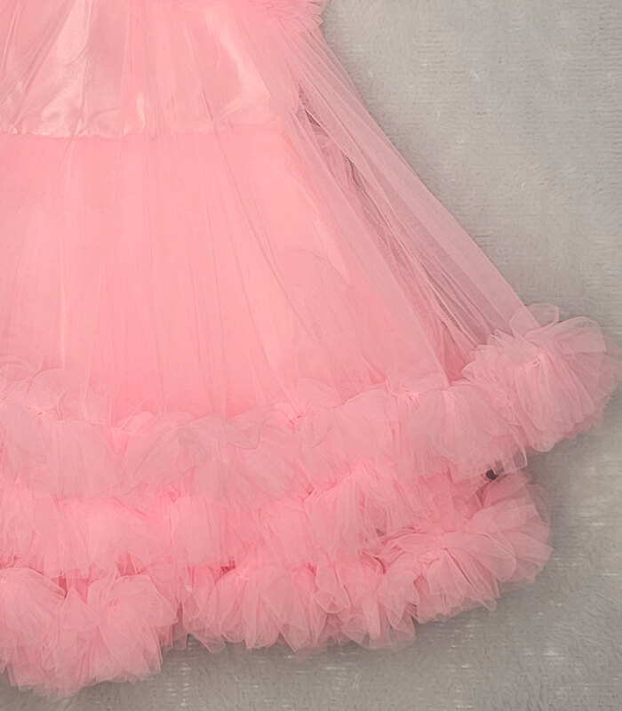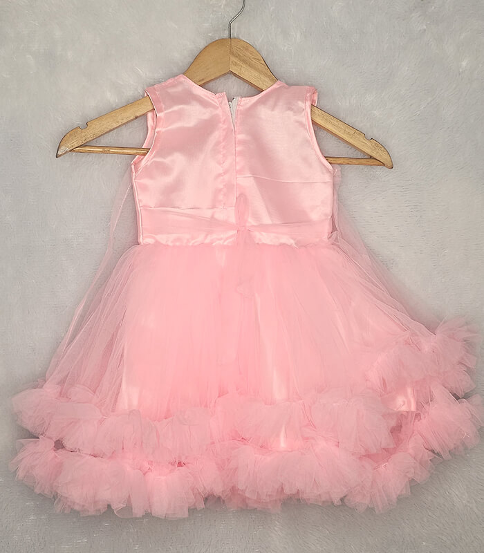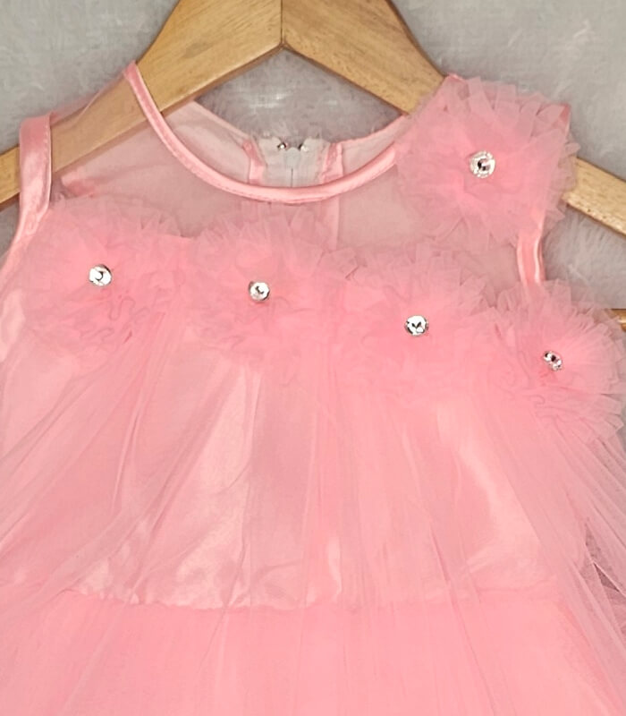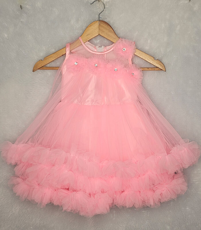 Let your little one steal the spotlight with this dreamy baby pink net frock, designed especially for girls aged 1 to 4 years. Crafted with layers of soft ruffled net and adorned with delicate floral appliqués on the shoulder, this frock adds a fairy-tale charm to any special occasion. Lightweight, airy, and skin-friendly, it’s perfect for birthdays, weddings, and festive celebrations.