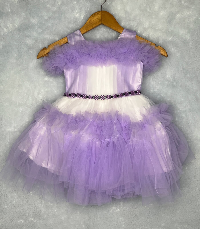 Add a refreshing splash of elegance to your little one’s wardrobe with this lavender and white party frock. Perfectly designed for baby girls aged 1 to 4 years, it features soft net ruffles, a floral pearl waistbelt, and a comfortable sleeveless design. The frock offers the perfect mix of playful charm and festive style — ideal for birthdays, weddings, or special events.
