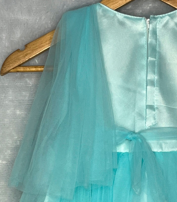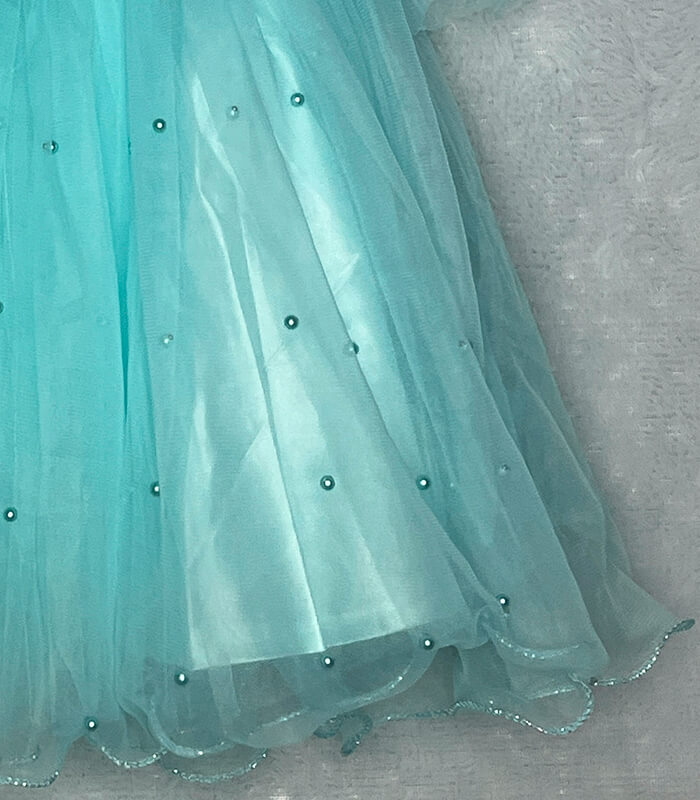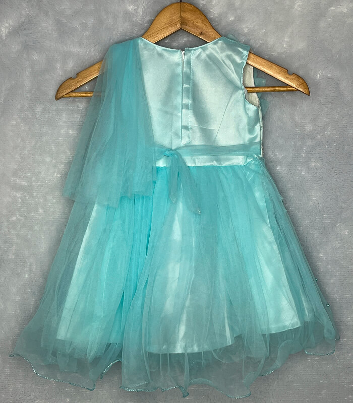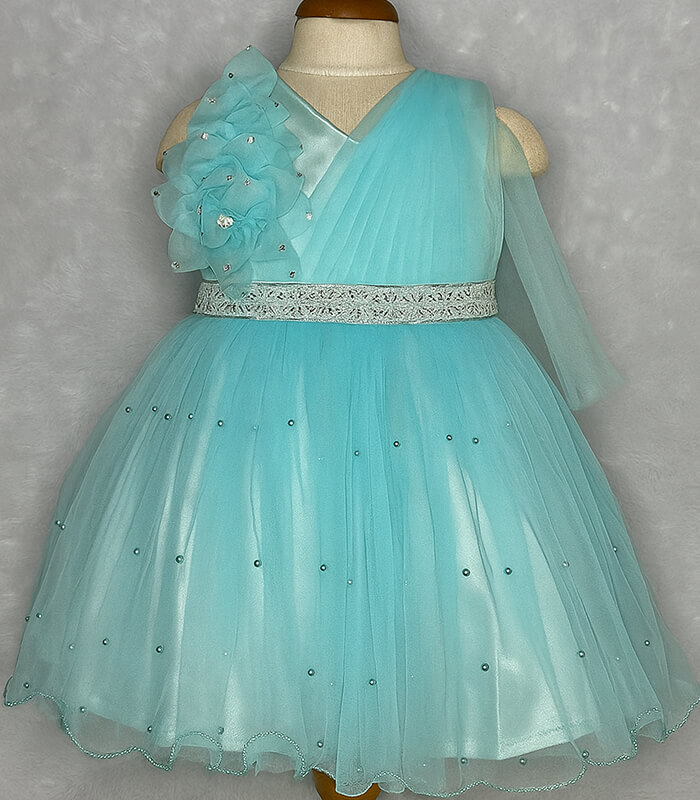Brighten your little one’s special day with this elegant Light Blue net frock, perfect for girls aged 1 to 4 years. This soft and flowy party wear features a one-shoulder pleated net design, a 3D floral appliqué on the shoulder, scattered pearl embellishments, and a shimmering silver waist belt for a complete festive look. The lightweight satin lining and breathable net ensure comfort along with style.