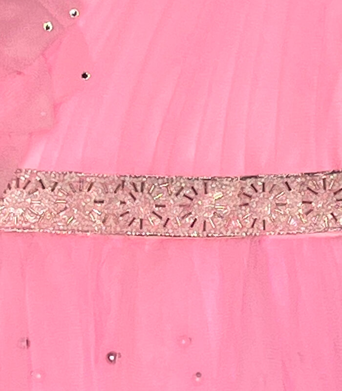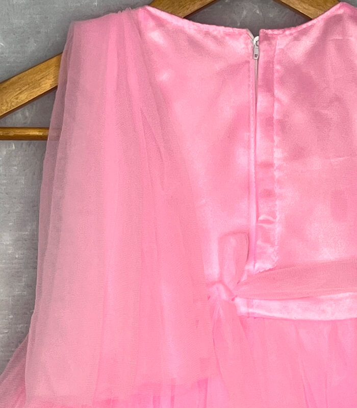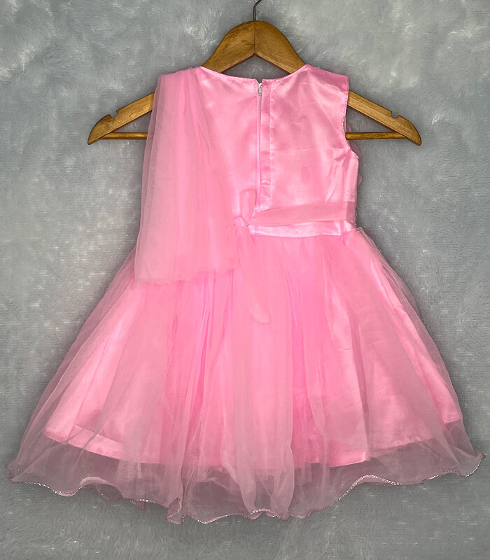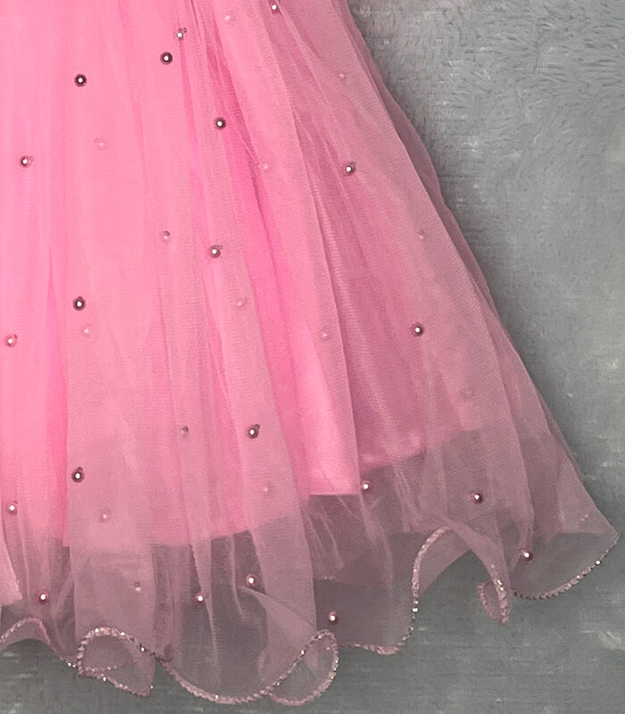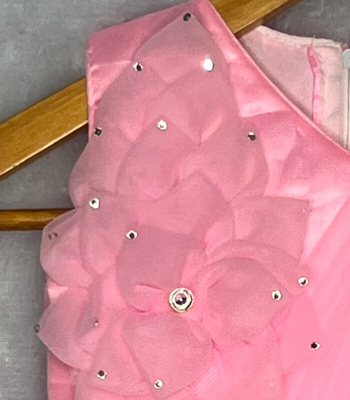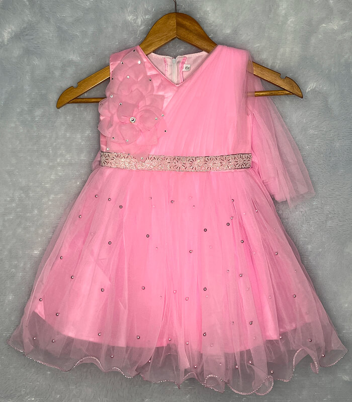 Brighten your little one’s special day with this elegant Pink net frock, perfect for girls aged 1 to 4 years. This soft and flowy party wear features a one-shoulder pleated net design, a 3D floral appliqué on the shoulder, scattered pearl embellishments, and a shimmering silver waist belt for a complete festive look. The lightweight satin lining and breathable net ensure comfort along with style.