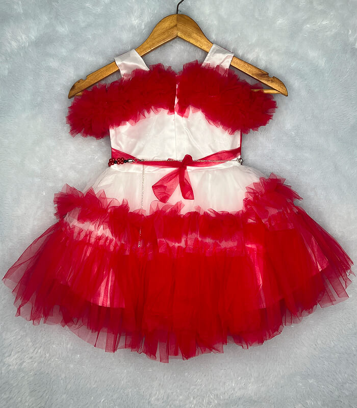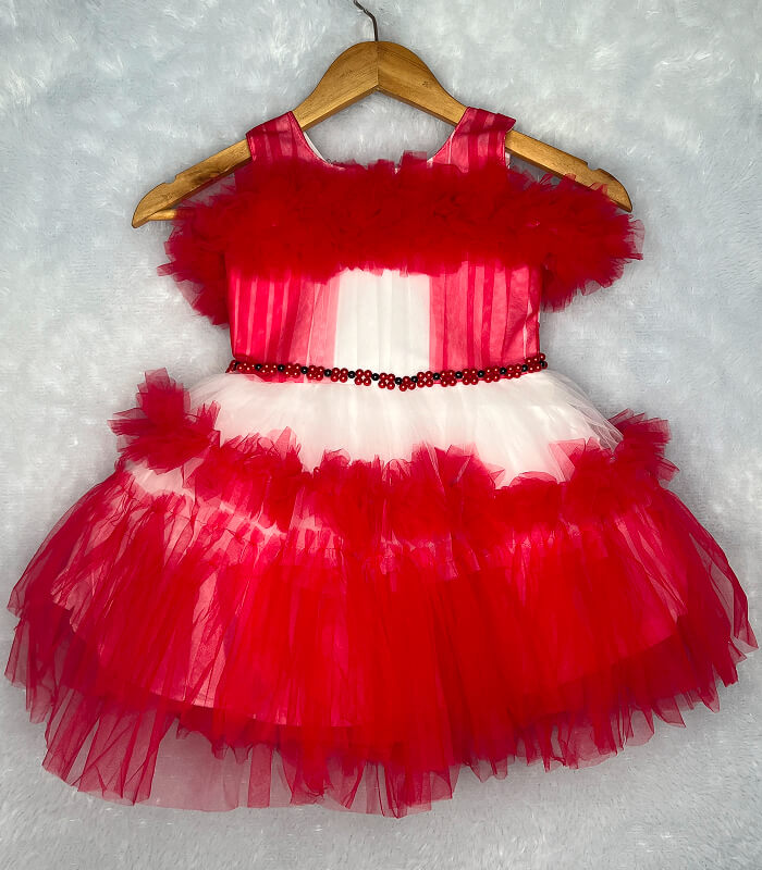 Add a refreshing splash of elegance to your little one’s wardrobe with this red and white party frock. Perfectly designed for baby girls aged 1 to 4 years, it features soft net ruffles, a floral pearl waistbelt, and a comfortable sleeveless design. The frock offers the perfect mix of playful charm and festive style — ideal for birthdays, weddings, or special events.