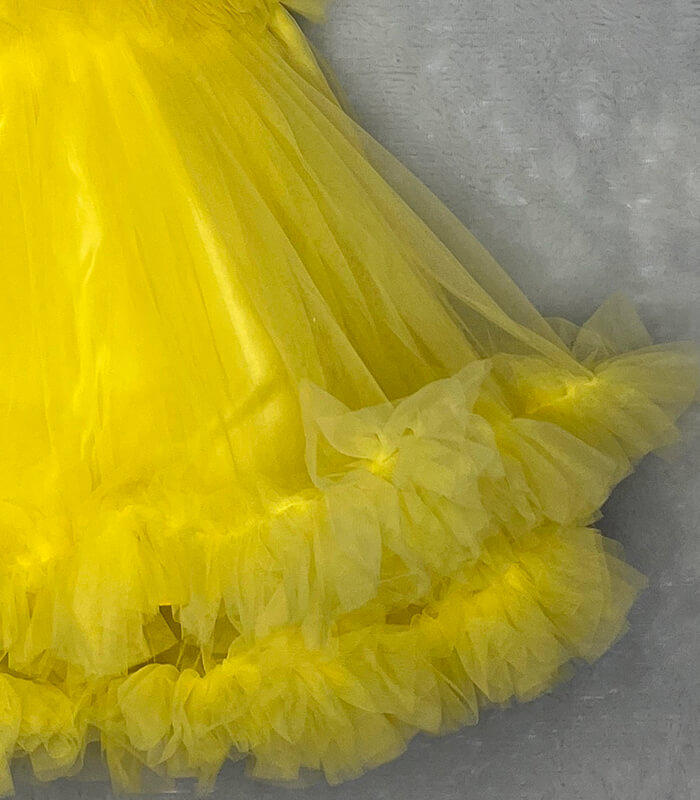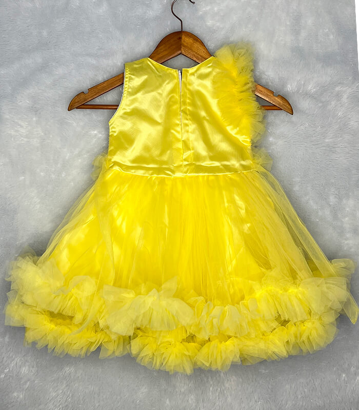 Bright, bold, and beautiful – this yellow net frock is the perfect party dress for baby girls aged 1 to 4 years. The shimmering sequin bodice paired with soft, fluffy net layers gives it a dreamy and stylish look. Designed with a unique one-shoulder floral accent and ruffled net frills on the hem, this frock is ideal for birthdays, festive occasions, and photoshoots. Comfortable satin inner lining makes it soft on the skin and easy to wear all day.